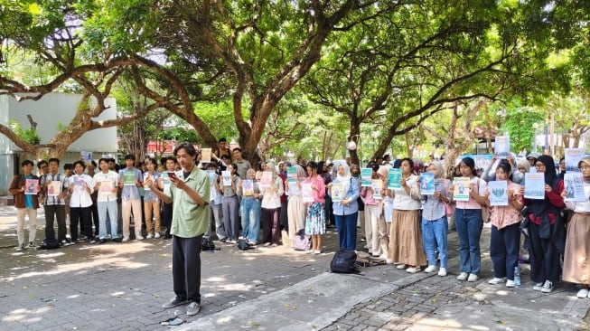 SuaraJogja.id - Sejumlah mahasiswa Ilmu Sejarah UNY menggelar aksi bertajuk 'Aksi Kami Kem-Arie' di Taman Pancasila UNY, Kamis (9/10/2025).