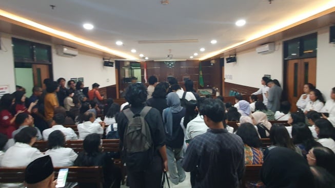 Sejumlah mahasiswa dan keluarga korban maupun terdakwa terlihat memenuhi ruangan. Sebagian tampak mengenakan pakaian putih, sementara lainnya berdiri sambil memegang ponsel, menunggu majelis hakim memasuki ruang sidang.