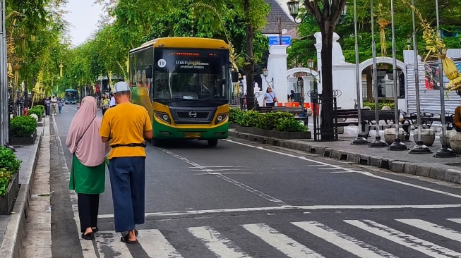 Bus TransJogja melintas di kawasan Malioboro, Jumat (21/11/2025). [Suara.com/Putu]