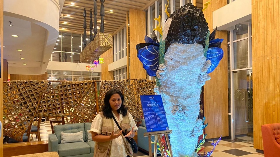 Instalasi ini juga menampilkan visual ikan mantare di depan hotel hingga hiasan lampu gantung berbentuk ubur-ubur yang terbuat dari bekas galon mineral sekali pakai. Seluruh karya ini pun menyampaikan pesan reflektif tentang dampak limbah terhadap ekosistem laut.